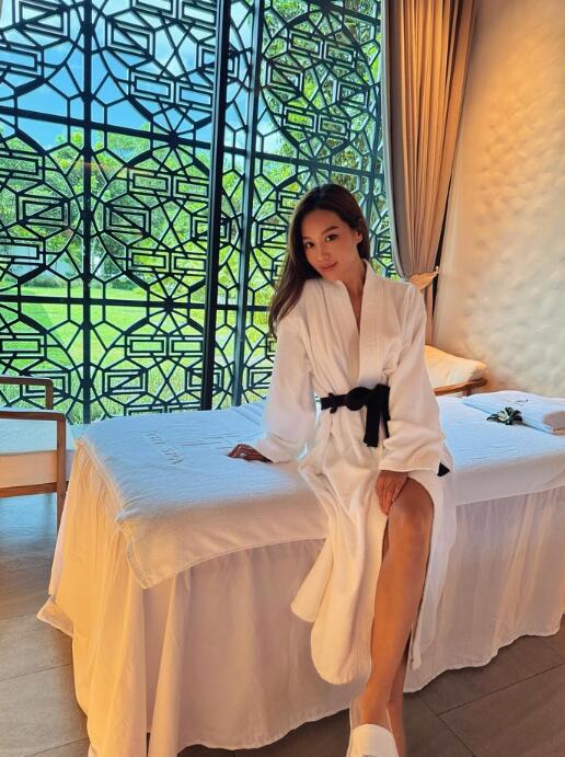 공개된 사진 속 김희정은 이국적인 휴양지에서 여유로운 일상을 즐기고 있다. 선베드에 앉아 코코넛 음료를 마시거나, 스파 공간에서 편안한 표정으로 휴식을 취하는 모습이 눈길을 끈다.