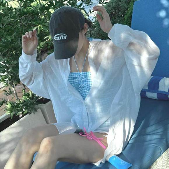 착장은 늦가을의 따뜻한 날씨에 어울리는 경쾌한 리조트 스타일이었다. 빌리 수현은 하늘색과 흰색이 어우러진 체크 무늬 원피스 수영복을 입고, 그 위에 얇은 흰색 시스루 셔츠를 걸쳐 청량한 무드를 완성했다. 셔츠는 비치는 질감 덕분에 수영복의 색감이 은은하게 드러났고, 바람에 가볍게 일렁이며 부드러운 리듬을 만들었다. 허벅지 쪽에는 분홍색 끈 디테일이 포인트처럼 매달려 있어 소녀다운 발랄함을 더했다.