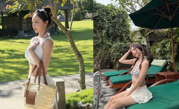 사진 속 은지는 발리 한 리조트 정원과 선베드를 배경으로 펀칭된 화이트 컬러, 스트라이프 등 디자인의 비키니를 입은 채 볼륨감 있는 몸매를 뽐냈다. 특히 청순하면서도 글래머러스한 모습이 시선을 사로잡는다.