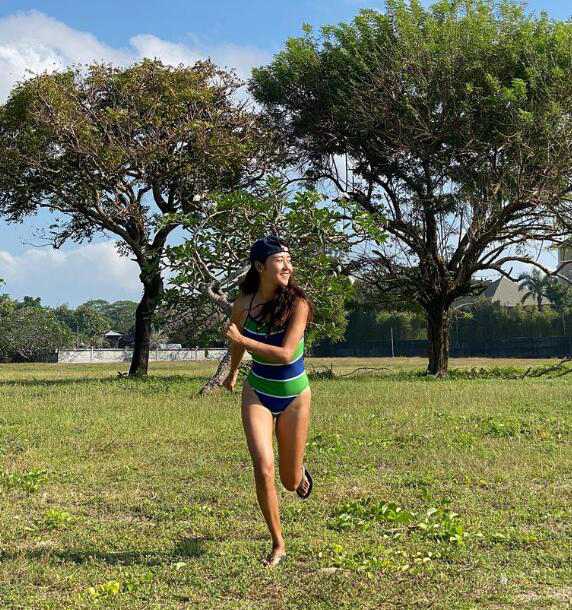 사진 속 허가윤은 머리에 캐주얼한 모자를 눌러 쓰고, 시원한 블루와 그린 컬러가 교차된 원피스 수영복 차림으로 드넓은 풀밭 위를 달리고 있다. 밝게 웃는 얼굴과 햇살이 스며든 건강한 피부, 자유로운 제스처는 초여름 오후의 한 장면을 떠오르게 했다. 잔디밭 곳곳에 흩어진 작은 풀들은 한층 생기를 더했고, 뒤로는 크고 푸른 나무 두 그루가 자연스러운 배경을 이뤘다. 살랑살랑 흔들리는 바람결에 옷깃이 휘날릴 듯한 모습 속, 허가윤의 경쾌한 에너지가 유감없이 드러났다.