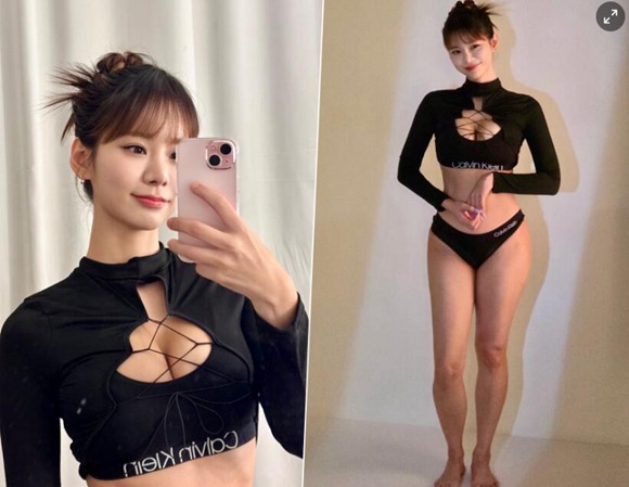 공개된 사진 속 맹승지는 가슴 라인을 과감하게 드러낸 브라톱과 잘록한 허리라인을 나타내는 수영복을 입고 셀피를 찍은 모습이다.