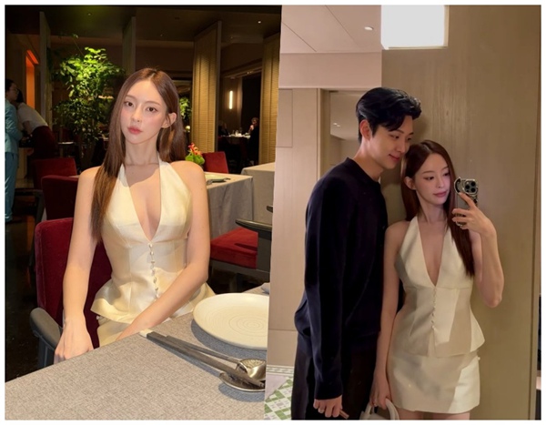 공개된 사진 속 송세라는 크림 톤의 홀터넥 미니드레스를 착용한 모습이다. 깊게 파인 네크라인과 코르셋 실루엣이 특징인 드레스는 슬림한 바디라인을 강조하며 우아한 분위기를 자아낸다. 은은하게 빛나는 새틴 소재가 조명 아래에서 고급스럽게 반짝이며, 간결한 스트레이트 헤어와 자연스러운 메이크업이 전체적인 스타일링을 완성한다.