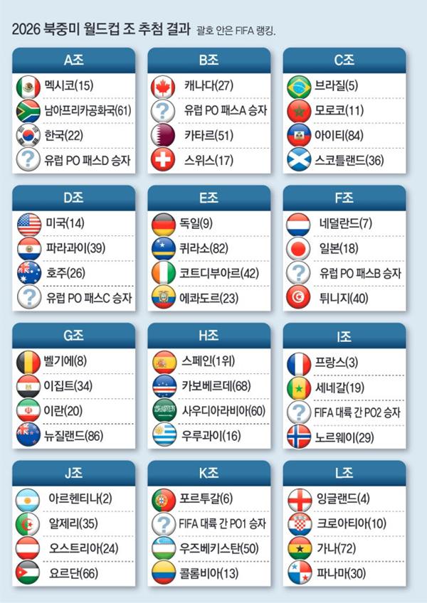 본선 참가국이 기존 32개국에서 48개국으로 늘어난 이번 월드컵은 4개 팀씩 12개 조로 나뉘어 조별리그를 치른 뒤 각 조 1, 2위와 3위 중 성적 상위 8개 팀이 32강 토너먼트에 진출한다. 조 추첨 포트2에 배정된 한국은 월드컵 역대 최다(5회) 우승국 브라질과 디펜딩 챔피언 아르헨티나, 국제축구연맹(FIFA) 랭킹 1위 스페인 등 포트1의 우승 후보들을 피했다. 개최국 자격으로 포트1에 들어간 멕시코와 포트3 국가 중 랭킹이 가장 낮은 남아공과 같은 조가 되면서 비교적 무난한 조 편성 결과를 얻었다. 미국 스포츠 전문 매체 ESPN은 한국이 조 2위로 32강에 오를 것으로 전망했다. 홍명보 한국 축구 국가대표팀 감독(56)은 조 추첨식을 마친 후 “잘 준비하면 좋은 경기를 할 수 있을 것 같다”고 말했다.