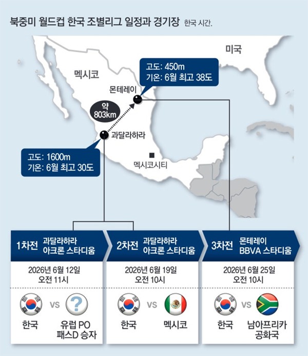 한국은 내년 6월 12일 멕시코 과달라하라의 아크론 스타디움에서 유럽 PO 패스D 승자와 1차전을 치르고, 일주일 뒤 같은 경기장에서 멕시코와 맞붙는다. 남아공과의 3차전은 같은 달 25일 멕시코 몬테레이의 BBVA 스타디움에서 열린다.