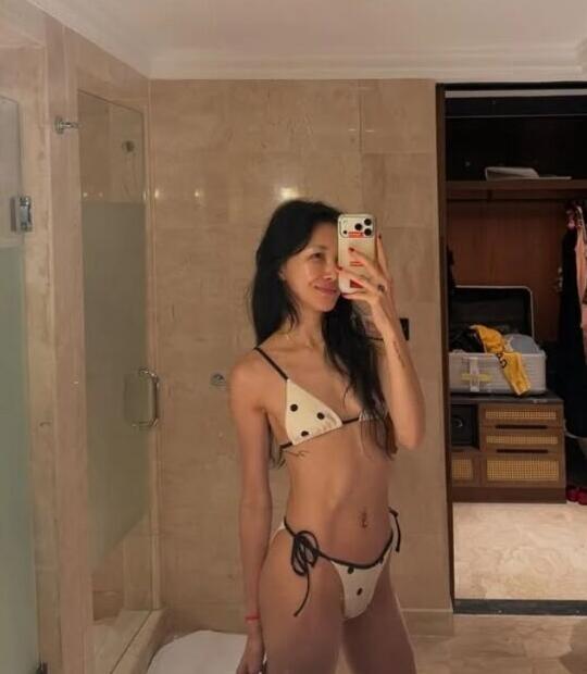 공개된 사진 속 윤혜진은 블랙 도트 무늬 비키니를 입고 포즈를 취하고 있다. 특히 갈비뼈가 두드러지게 드러날 정도로 슬림한 이른바 ‘뼈말라‘ 체형이 시선을 사로잡았다.
